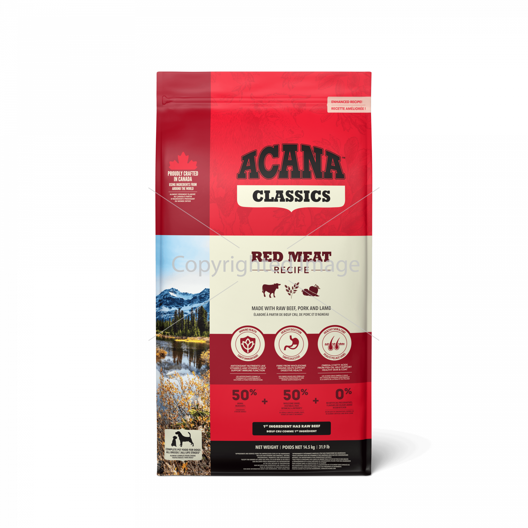 Рецептури ACANA ретельно готуються зі смачних та якісних інгредієнтів, від початку і до кінця. Баланс цієї рецептури розподілений у пропорції 50/50 між багатим вмістом м’ясних інгредієнтів та високопоживними фруктами та овочами та зерновими. Рецептура АКАНА Классікс Ред Міт Ресіпе забезпечує вашого собаку ситною та поживною їжею, виготовленою з простих та корисних інгредієнтів. Також ця рецептура включає високопоживні інгредієнти, що забезпечують підтримку ключових запорук здоров’я, включаючи імунну функцію, здоров’я травлення та здоров’я шкіри та шерсті.