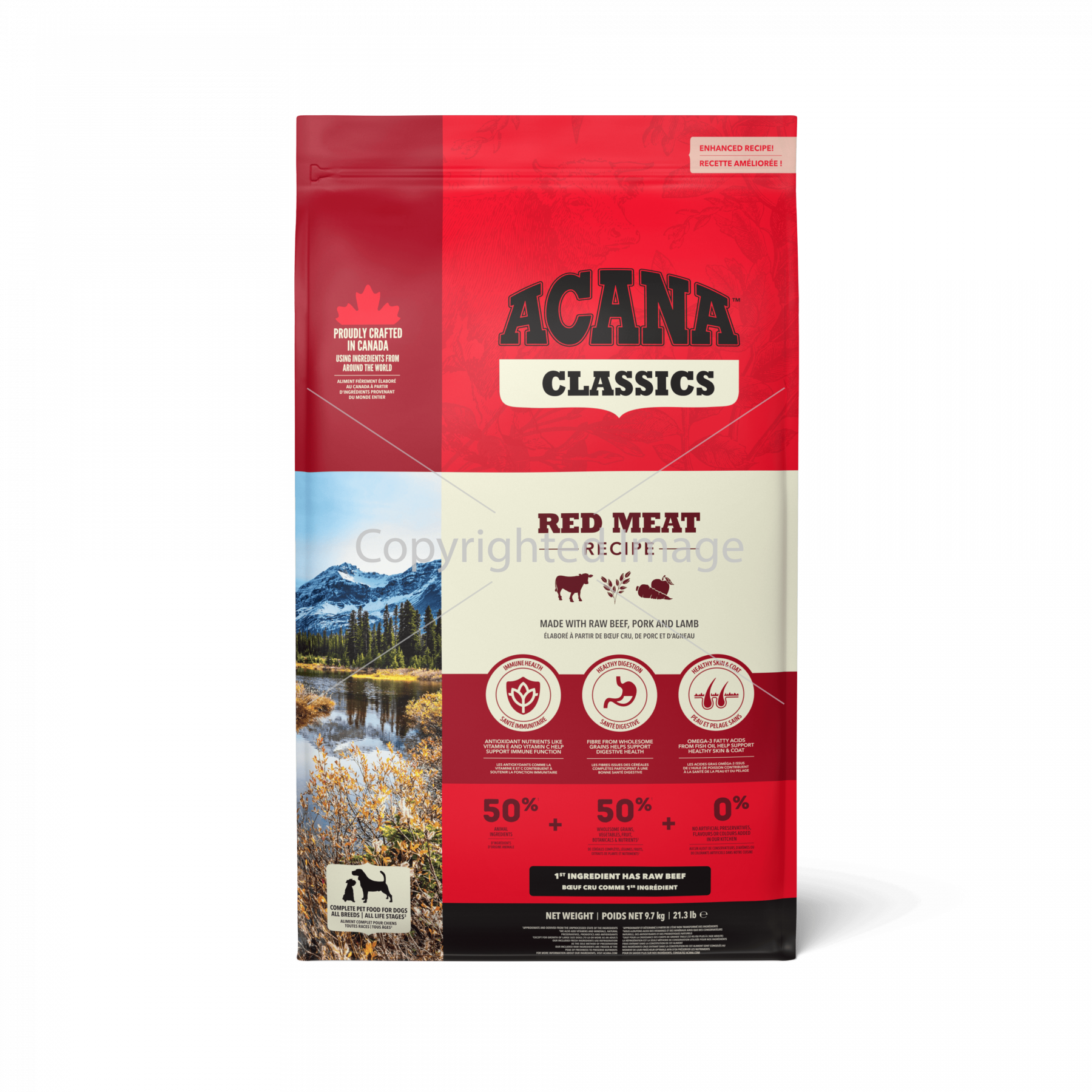 Рецептури ACANA ретельно готуються зі смачних та якісних інгредієнтів, від початку і до кінця. Баланс цієї рецептури розподілений у пропорції 50/50 між багатим вмістом м’ясних інгредієнтів та високопоживними фруктами та овочами та зерновими. Рецептура АКАНА Классікс Ред Міт Ресіпе забезпечує вашого собаку ситною та поживною їжею, виготовленою з простих та корисних інгредієнтів. Також ця рецептура включає високопоживні інгредієнти, що забезпечують підтримку ключових запорук здоров’я, включаючи імунну функцію, здоров’я травлення та здоров’я шкіри та шерсті.