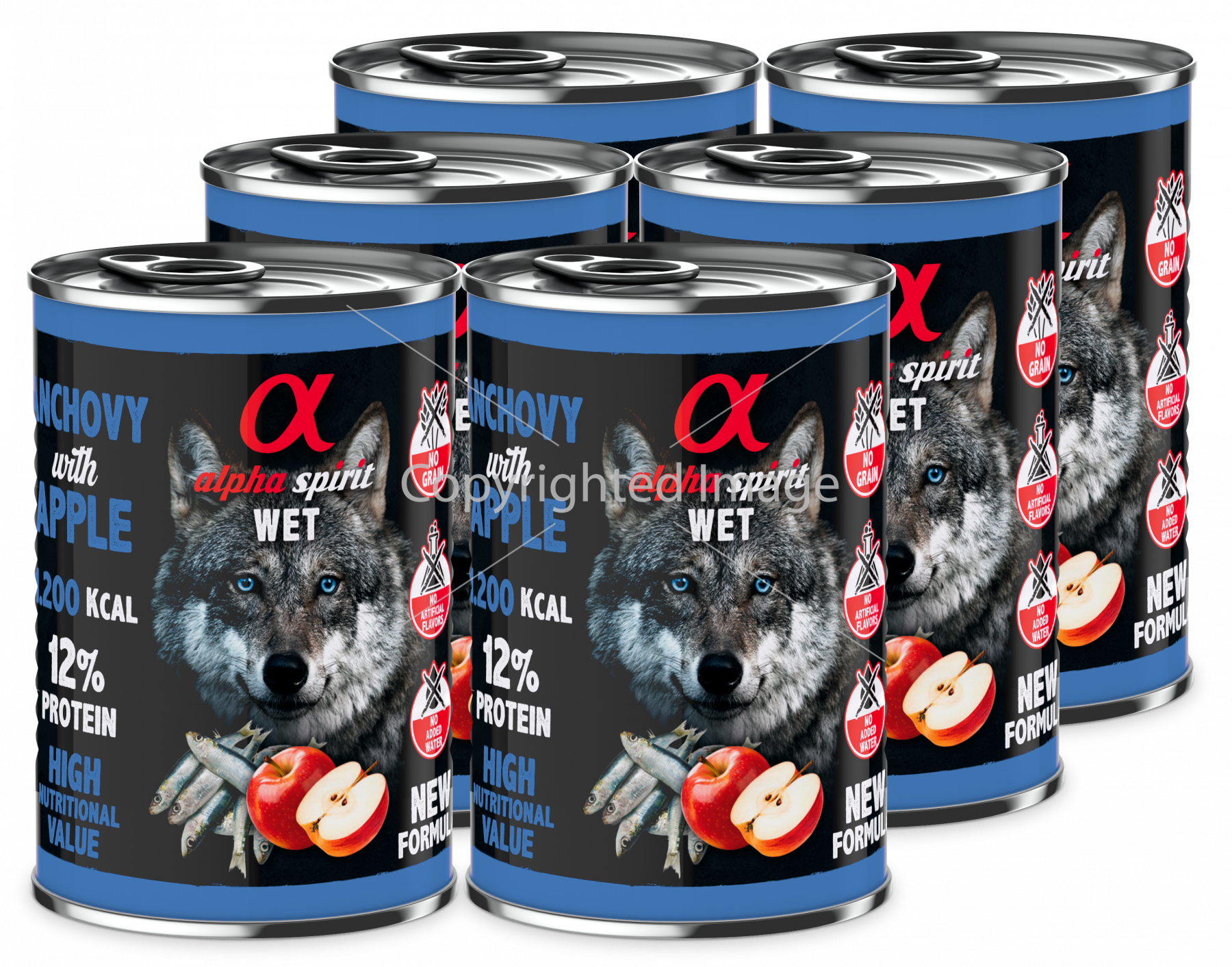 Вологий корм Alpha Spirit Anchovy With Red Apple готується з використанням єдиного джерела протеїну - з анчоусів (93%), з додаванням маленьких шматочків свіжих червоних яблук.