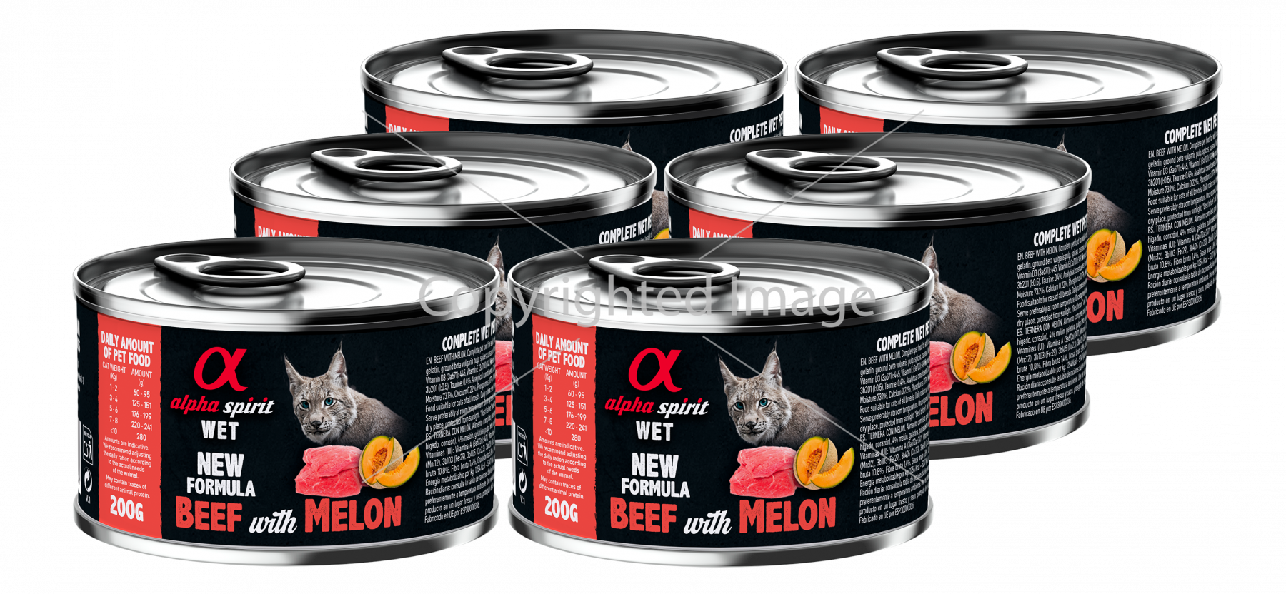 Ніжна та смачна рецептура вологого корму Альфа Спіріт з яловичиною та маленькими шматочками ніжної дині у формі паштету створена для дорослих котів всіх порід.