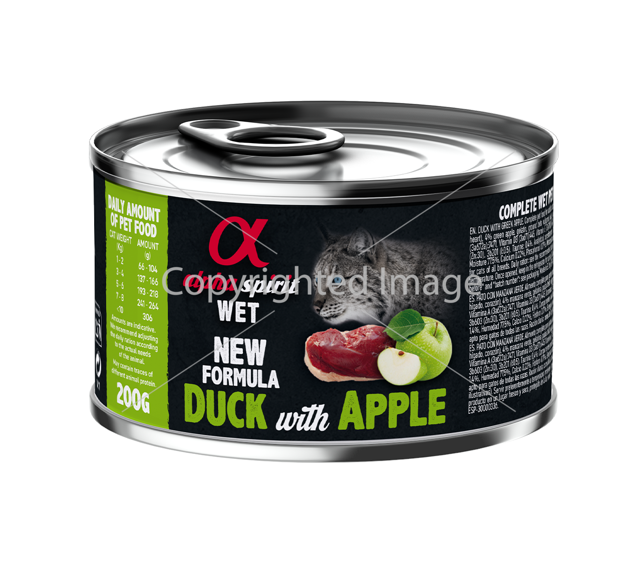 Ніжна та смачна рецептура вологого корму Альфа Спіріт з м’ясом качки (30%) та курятини (63%) та шматочками свіжих зелених яблук у формі паштету створена для дорослих котів всіх порід.