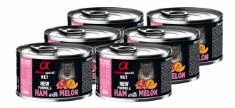 Ніжна та смачна рецептура вологого корму Альфа Спіріт з шинкою та шматочками свіжої дині у формі паштету створена для дорослих котів всіх порід.