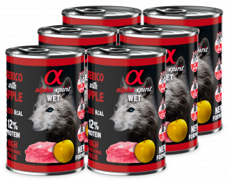 Ніжна та смачна рецептура вологого корму Альфа Спіріт з іберійською свининою (93%) та яблуками у формі паштету створена для дорослих собак всіх порід.