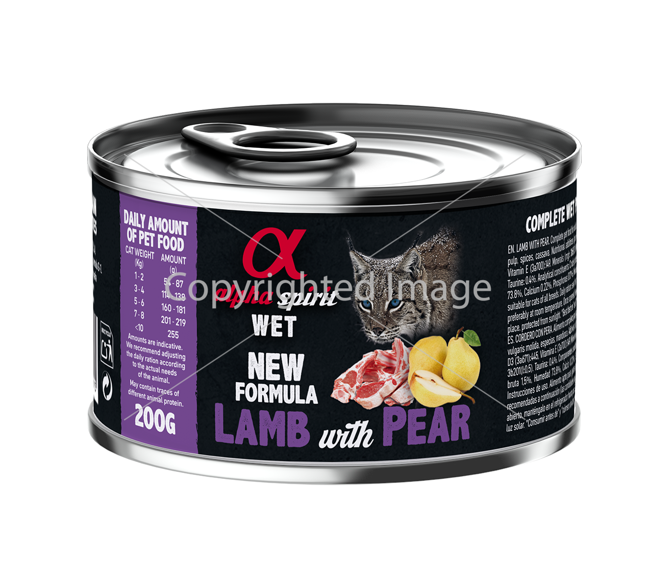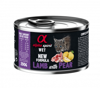 Вологий корм Alpha Spirit Lamb with Pear для дорослих котів готується з інгредієнтів преміальної якості добавкою таурину, де єдиним джерелом протеїну – є ягнятина(93%).
