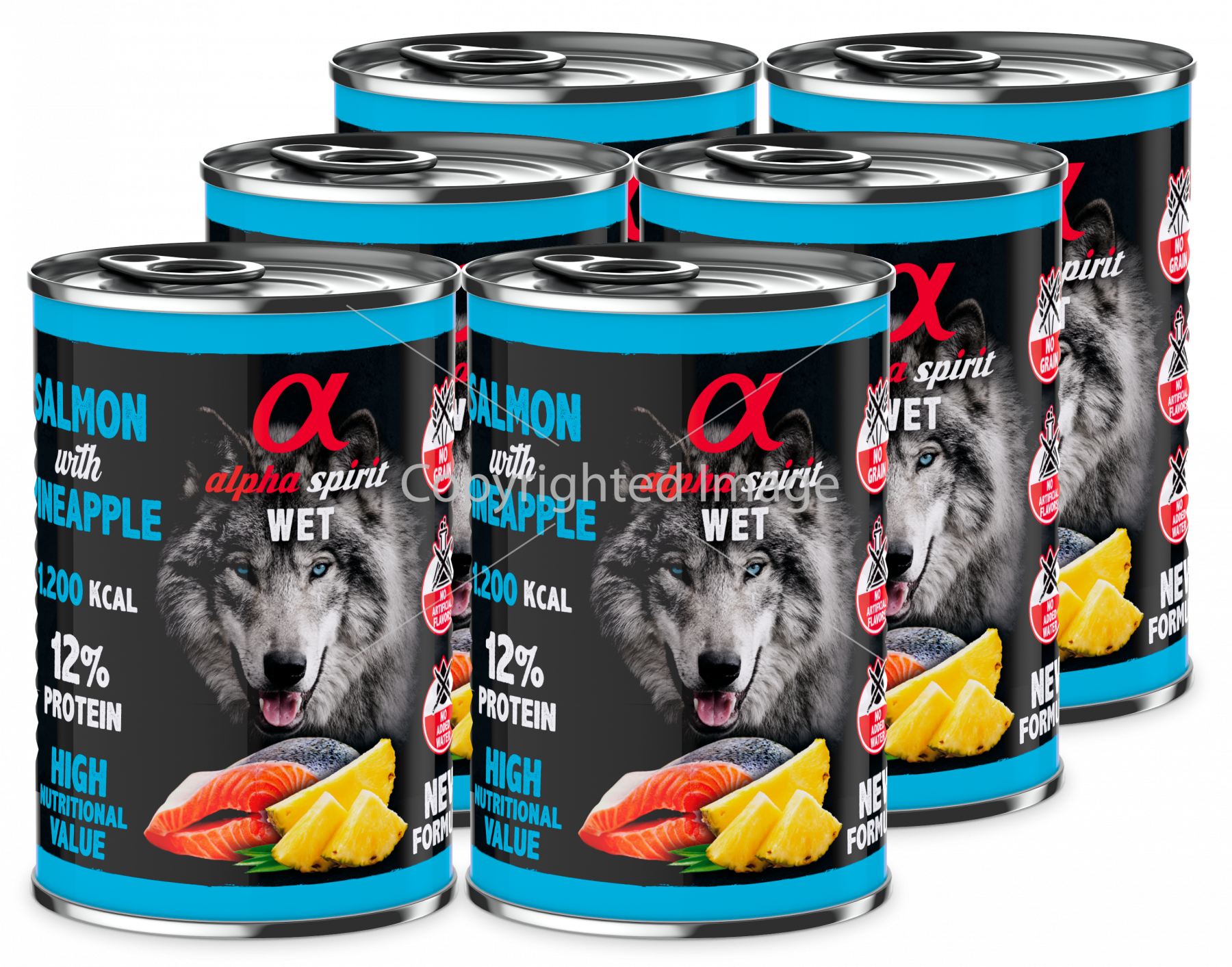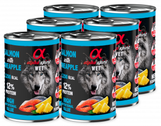 Ніжна та смачна рецептура вологого корму Альфа Спіріт лососем (93%) та шматочками ананасу у формі паштету створена для дорослих собак всіх порід.