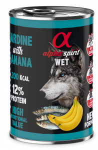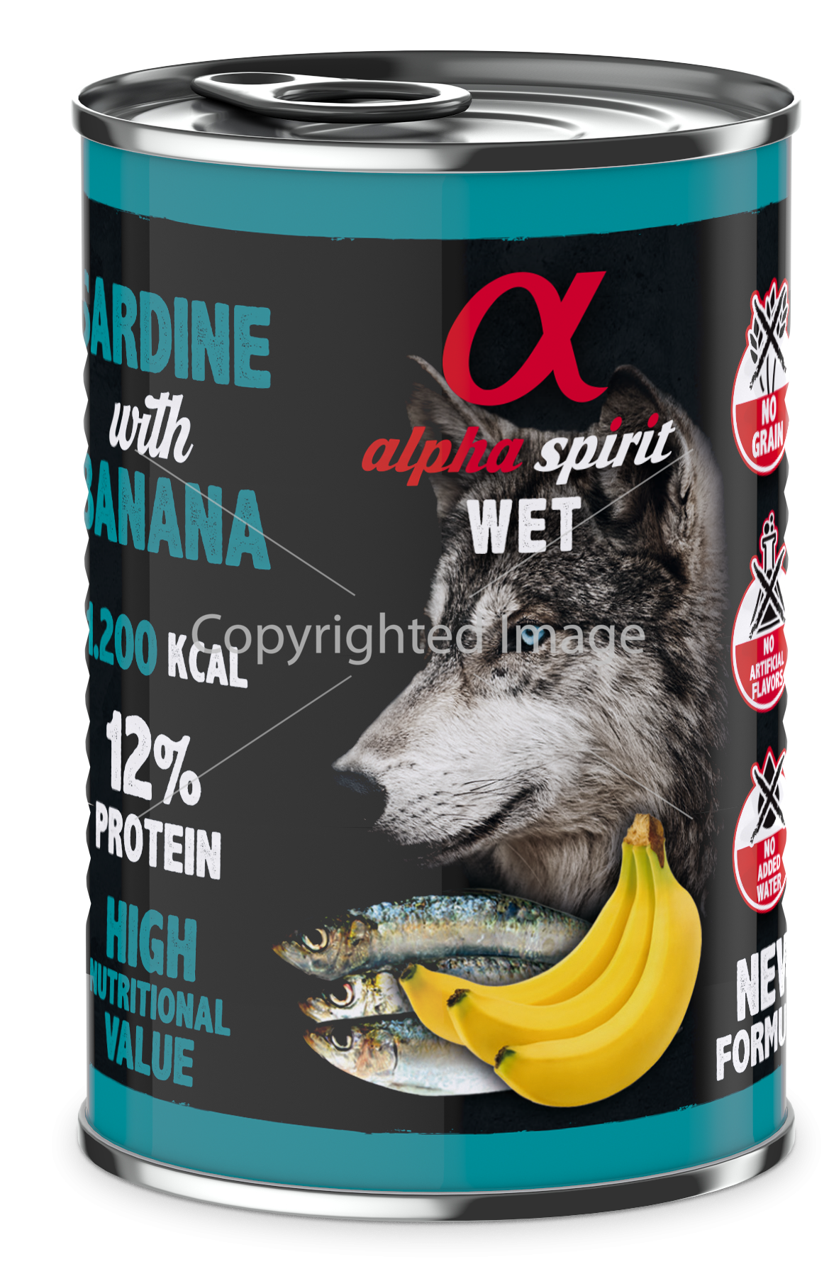 Вологий корм Alpha Spirit Alpha Spirit Sardine with Banana готується з використанням єдиного джерела протеїну – сардини, з додаванням шматочків свіжого банану .