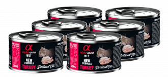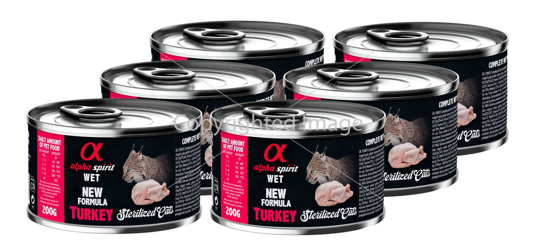Вологий корм Alpha Spirit Turkey Sterilized Cat для стерилізованих котів виготовляється з інгредієнтів преміальної якості з добавками таурину та L-карнітину, де єдиним джерелом протеїну є індичка (92%).