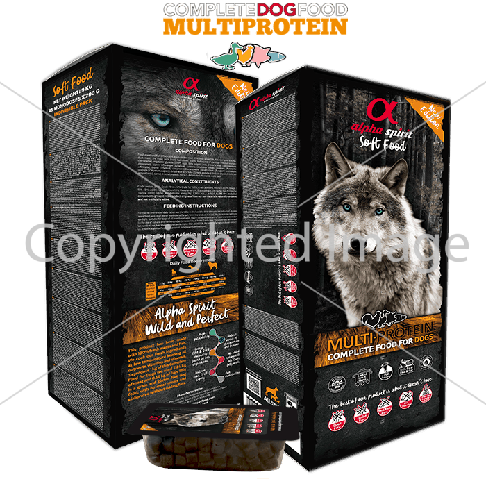 Корм виготовлено зі свіжої риби і м'яса, а для виробництва 1 кг повноцінного, гіпоалергенного, напіввологого корму АЛЬФА СПІРІТ МУЛЬТИПРОТЕЇН для собак використано 2 кг свіжого м'яса і 0,5 кг свіжої риби.
