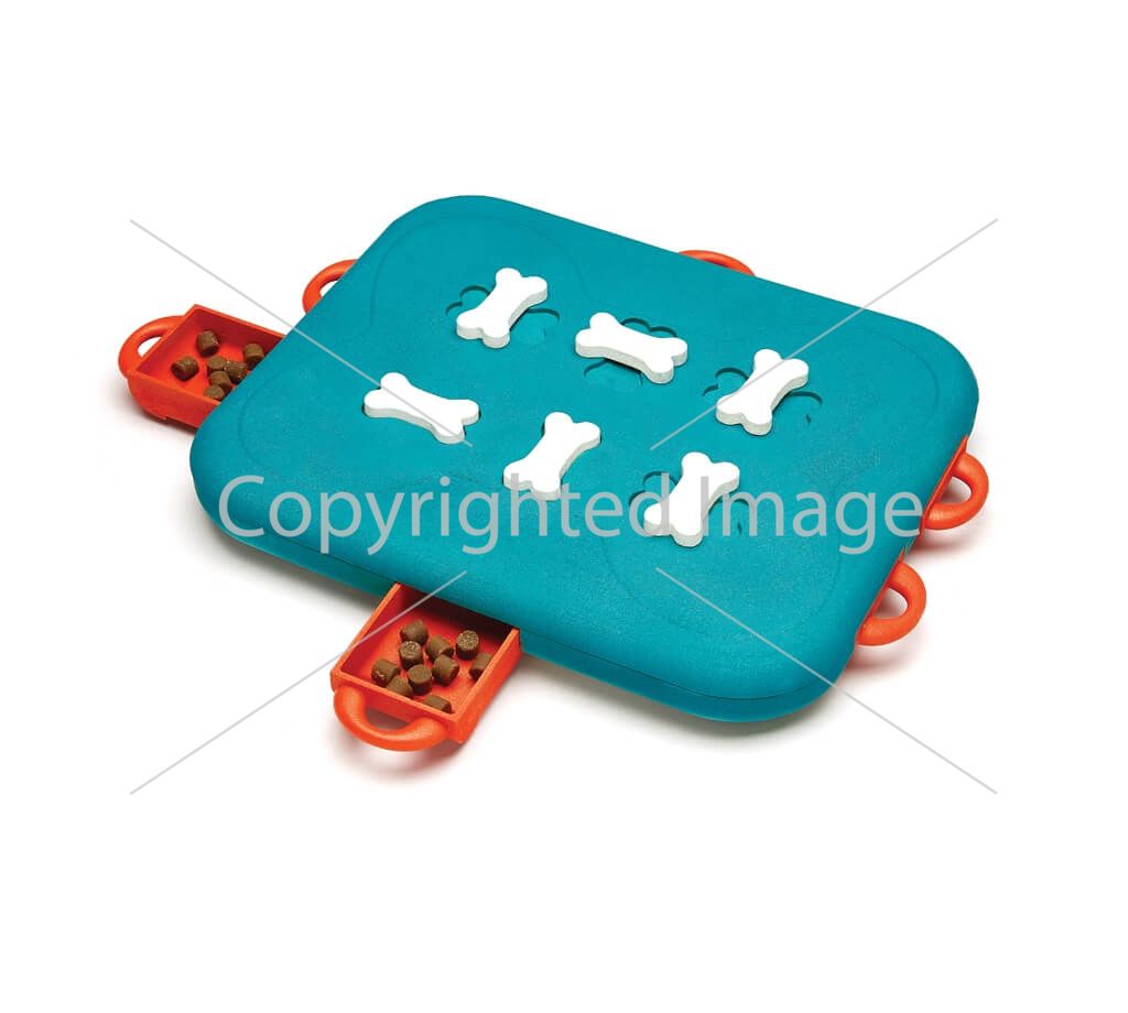 ЯК ГРАТИ: коли кісточки знаходяться в розблокованому положенні, відкрийте висувні ящики та покладіть всередину гранули або ласощі. Закрийте висувні ящики та заблокуйте кісточки. Отже, почнемо гру! Помістіть гру на підлозі та заохотьте вихованця шукати ласощі. Собаки розумніші, ніж ми думаємо. Іноді їм достатньо лише щось показати. Щоб розпалити інтерес вихованця до гри, залиште незаблокованими декілька кісточок та відкритими декілька висувних ящиків.