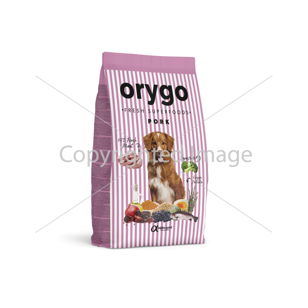 Склад: 52% свіжа свинина (м’ясо, печінка, серце), 30% свіжа риба, частково гідролізований крохмаль, свіже броколі 4%, рослинний гліцерин. ORYGOFORMULA 2.6%: продукти ферментації дріжджів, S. Cerivisiae (MOS), куркума, оливкова олія (джерело поліфенолів), криль (джерело глюкозаміну), інулін (джерело ФОС), шавлія, кіноа, м’ята, фенхель, юка мохаве, розмарин, орегано, чебрець, валеріана, екстракт чорниці, екстракт граната (джерело елагової кислоти), гідролізований колаген (джерело хондроїтину), розторопша (джерело силімарину), солодка, алое вера без алоїну, екстракт артишоку (джерело цинарину), прополіс, олія форелі 500 мг/кг (джерело омега 3, ЕПК, ДГК).