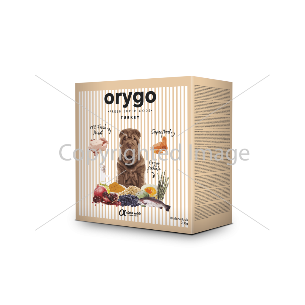 Склад: 52% свіжа індичка (м’ясо, печінка, серце), 30% свіжа курятина, частково гідролізований крохмаль, гарбуз 4%, рослинний гліцерин. ORYGOFORMULA 2.6%: продукти ферментації дріжджів, S. Cerivisiae (MOS), куркума, оливкова олія (джерело поліфенолів), інулін (джерело ФОС), м’якоть цикорію, шавлія, кіноа, м’ята, фенхель, юка мохаве, розмарин, орегано, чебрець, валеріана, екстракт чорниці (джерело антоціанозидів та танінів), екстракт гранату (джерело елагової кислоти), розторопша (джерело силімарину), солодка, алое вера без алоїну, екстракт артишоку (джерело цинарину), прополіс. Яєчна мембрана (джерело глюкозаміну, хондроїтину сульфат та колагену I, V, X), олія форелі 500 мг/кг (джерело омега 3, ЕПК, ДГК).