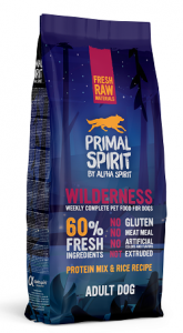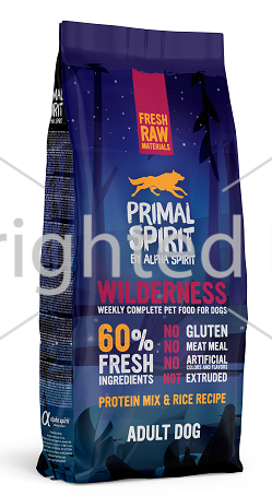 Прімал спіріт Вайлдернесс – це натуральний повнораціонний сухий корм без глютену для дорослих собак, виготовлений зі свіжих інгредієнтів, з щедрим вмістом м’ясних протеїнів, рисом, з додаванням природних джерел вітамінів та мінералів.
