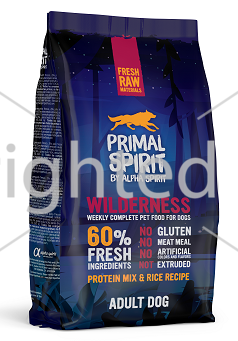 Прімал спіріт Вайлдернесс – це натуральний повнораціонний сухий корм без глютену для дорослих собак, виготовлений зі свіжих інгредієнтів, з щедрим вмістом м’ясних протеїнів, рисом, з додаванням природних джерел вітамінів та мінералів.